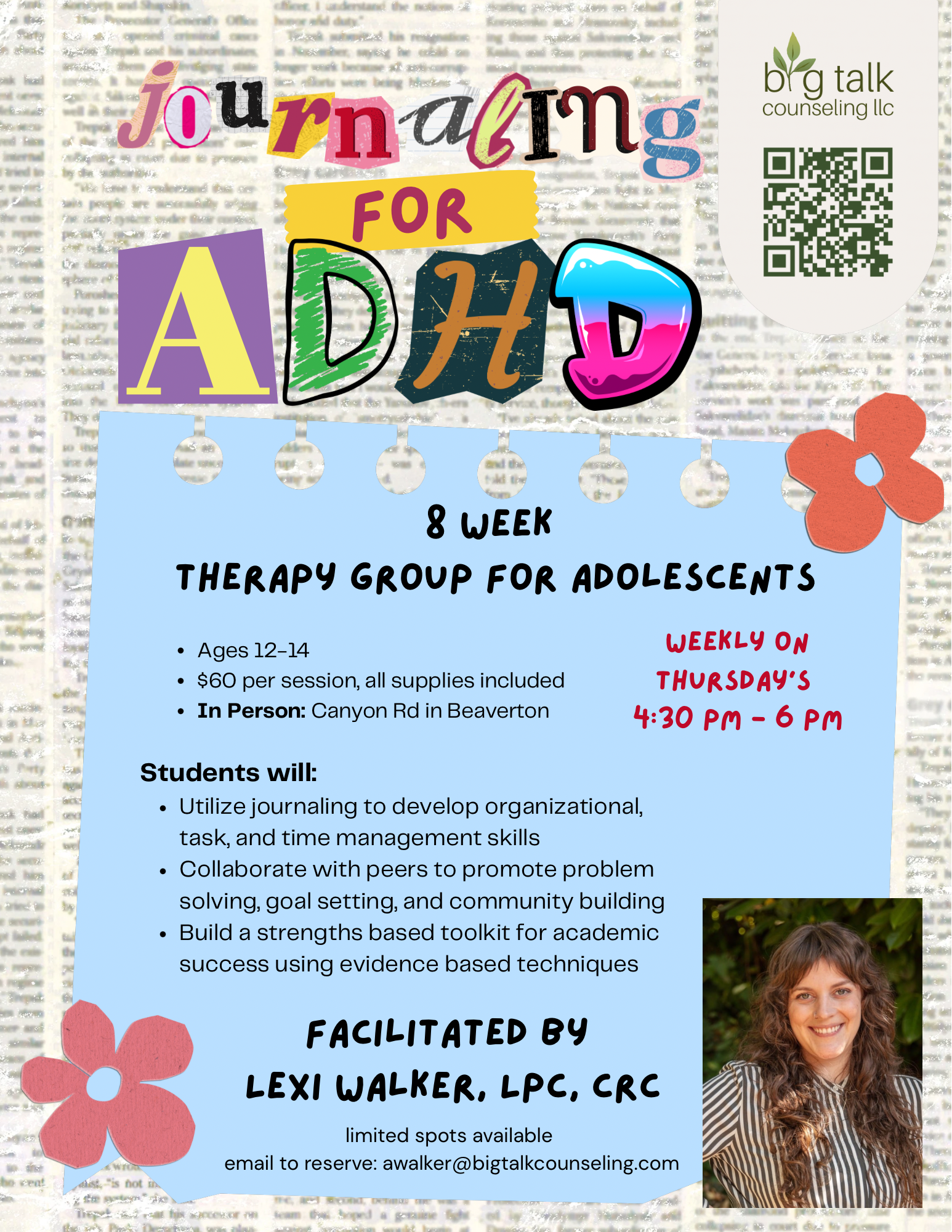 For the creative, spontaneous, and curious middle schooler. Come make community with neurodivergent peers, share academic tips and tricks, and have guided journaling support from a neurodivergent and crafty mental health therapist.